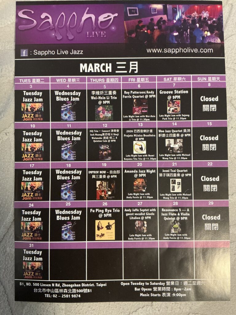 しかし、これは僕がジャズファンだから知っているのであって、普通の台湾の人達が、或いは日本の駐在員がこれらのジャズスポットを詳しく知っているわけではありません。一般の人は、Blue Note Taipei や Sappho(サッフォー) の名前を聞いたことがあるという程度だと思います。